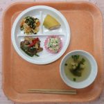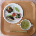 | 5 | 6 揚げさばのみぞれかけ、厚揚げとアスパラのチャンプルー、海藻サラダ、えのきと小松菜の味噌汁、オレンジ |