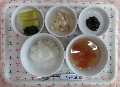 お子さまの発達状態(咀嚼状態)に応じて、適切な内容や形状および量を準備しています。 本日の離乳食は3種類です。