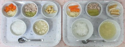 お子さまの発達状態(咀嚼状態)に応じて、適切な内容や形状および量を準備しています。 本日の離乳食は2種類です。