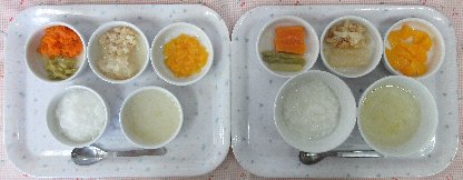 お子さまの発達状態(咀嚼状態)に応じて、適切な内容や形状および量を準備しています。 本日の離乳食は2種類です。