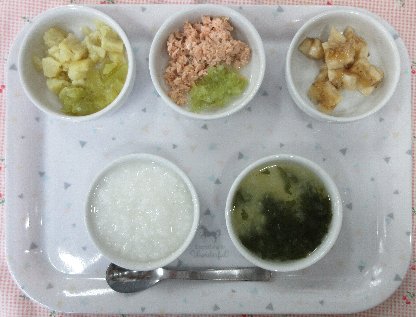 お子さまの発達状態(咀嚼状態)に応じて、適切な内容や形状および量を準備しています。 本日の離乳食は1種類です。