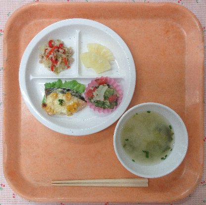 - ※献立表には載せていませんが盛り付け時は、キャベツ・ブロッコリー・トマト・枝豆・とうもろこし等を添え野菜として使用しています。