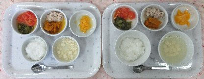 お子さまの発達状態(咀嚼状態)に応じて、適切な内容や形状および量を準備しています。 本日の離乳食は2種類です。