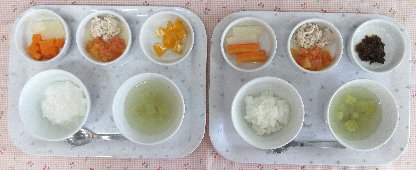 お子さまの発達状態(咀嚼状態)に応じて、適切な内容や形状および量を準備しています。 本日の離乳食は2種類です。