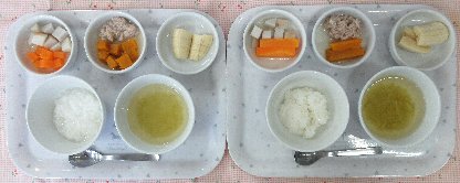 お子さまの発達状態(咀嚼状態)に応じて、適切な内容や形状および量を準備しています。 本日の離乳食は2種類です。