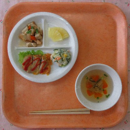 - ※献立表には載せていませんが盛り付け時は、キャベツ・ブロッコリー・トマト・枝豆・とうもろこし等を添え野菜として使用しています。