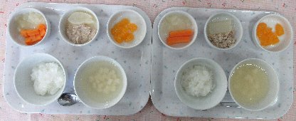 お子さまの発達状態(咀嚼状態)に応じて、適切な内容や形状および量を準備しています。 本日の離乳食は2種類です。