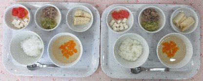 お子さまの発達状態(咀嚼状態)に応じて、適切な内容や形状および量を準備しています。 本日の離乳食は2種類です。
