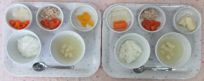 お子さまの発達状態(咀嚼状態)に応じて、適切な内容や形状および量を準備しています。 本日の離乳食は2種類です。