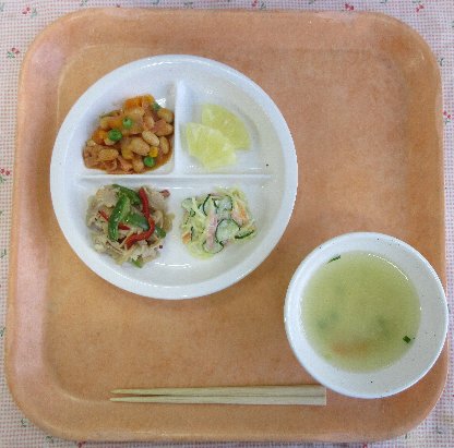 - ※献立表には載せていませんが盛り付け時は、キャベツ・ブロッコリー・トマト・枝豆・とうもろこし等を添え野菜として使用しています。