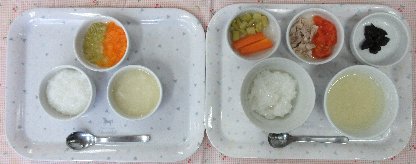 お子さまの発達状態(咀嚼状態)に応じて、適切な内容や形状および量を準備しています。 本日の離乳食は2種類です。