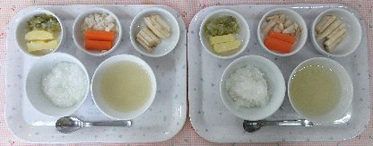 お子さまの発達状態(咀嚼状態)に応じて、適切な内容や形状および量を準備しています。 本日の離乳食は2種類です。