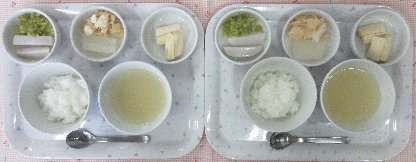 お子さまの発達状態(咀嚼状態)に応じて、適切な内容や形状および量を準備しています。 本日の離乳食は2種類です。