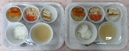 お子さまの発達状態(咀嚼状態)に応じて、適切な内容や形状および量を準備しています。 本日の離乳食は2種類です。