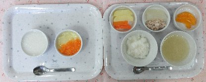 お子さまの発達状態(咀嚼状態)に応じて、適切な内容や形状および量を準備しています。 本日の離乳食は2種類です。