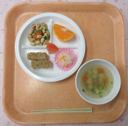 - ※献立表には載せていませんが盛り付け時は、キャベツ・ブロッコリー・トマト・枝豆・とうもろこし等を添え野菜として使用しています。