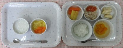 お子さまの発達状態(咀嚼状態)に応じて、適切な内容や形状および量を準備しています。 本日の離乳食は2種類です。