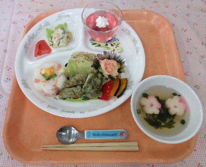 - ※献立表には載せていませんが盛り付け時は、キャベツ・ブロッコリー・トマト・枝豆・とうもろこし等を添え野菜として使用しています。