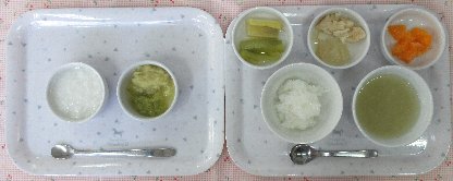 お子さまの発達状態(咀嚼状態)に応じて、適切な内容や形状および量を準備しています。 本日の離乳食は2種類です。