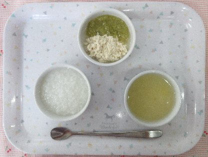 お子さまの発達状態(咀嚼状態)に応じて、適切な内容や形状および量を準備しています。 本日の離乳食は1種類です。