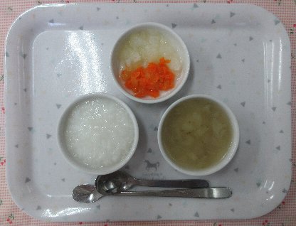 お子さまの発達状態(咀嚼状態)に応じて、適切な内容や形状および量を準備しています。 本日の離乳食は1種類です。