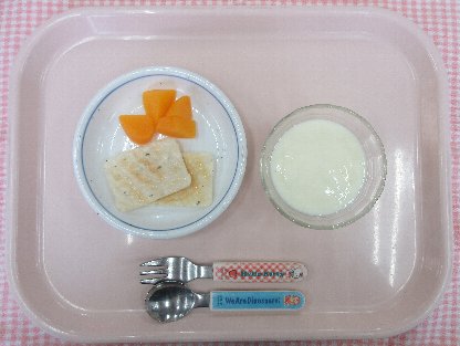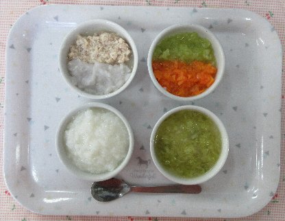 お子さまの発達状態(咀嚼状態)に応じて、適切な内容や形状および量を準備しています。 本日の離乳食は1種類です。
