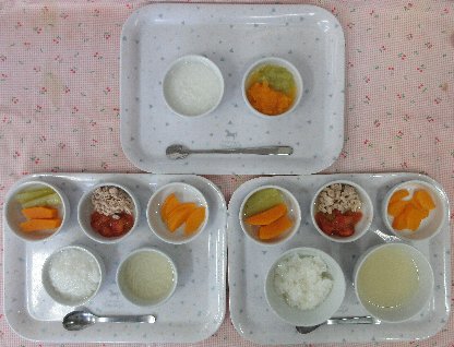 お子さまの発達状態(咀嚼状態)に応じて、適切な内容や形状および量を準備しています。 本日の離乳食は3種類です。