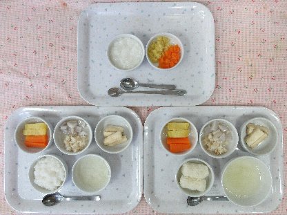 お子さまの発達状態(咀嚼状態)に応じて、適切な内容や形状および量を準備しています。 本日の離乳食は3種類です。