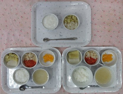 お子さまの発達状態(咀嚼状態)に応じて、適切な内容や形状および量を準備しています。 本日の離乳食は3種類です。