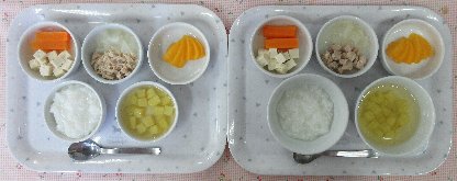 お子さまの発達状態(咀嚼状態)に応じて、適切な内容や形状および量を準備しています。 本日の離乳食は2種類です。