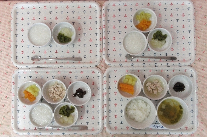 お子さまの発達状態(咀嚼状態)に応じて、適切な内容や形状および量を準備しています。 本日の離乳食は4種類です。