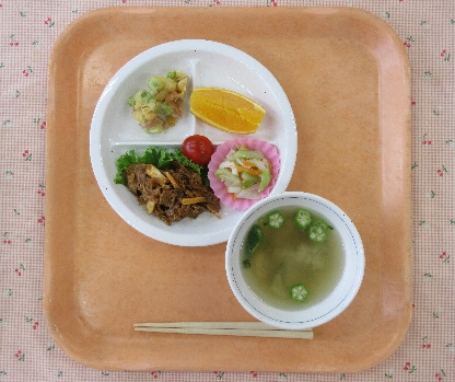- ※献立表には載せていませんが盛り付け時は、キャベツ・ブロッコリー・トマト・枝豆・とうもろこし等を添え野菜として使用しています。