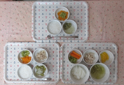 お子さまの発達状態(咀嚼状態)に応じて、適切な内容や形状および量を準備しています。 本日の離乳食は3種類です。