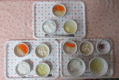 お子さまの発達状態(咀嚼状態)に応じて、適切な内容や形状および量を準備しています。 本日の離乳食は3種類です。