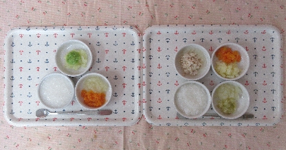 お子さまの発達状態(咀嚼状態)に応じて、適切な内容や形状および量を準備しています。 本日の離乳食は2種類です。