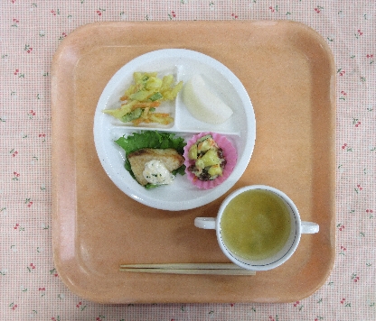 - ※献立表には載せていませんが盛り付け時は、キャベツ・ブロッコリー・トマト・枝豆・とうもろこし等を添え野菜として使用しています。
