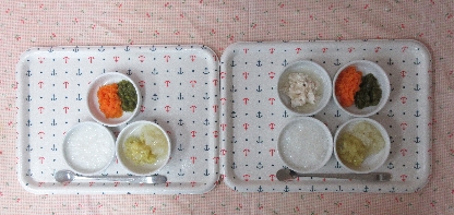 お子さまの発達状態(咀嚼状態)に応じて、適切な内容や形状および量を準備しています。 本日の離乳食は2種類です。
