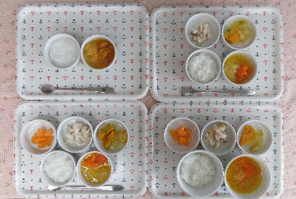 お子さまの発達状態(咀嚼状態)に応じて、適切な内容や形状および量を準備しています。 本日の離乳食は4種類です。