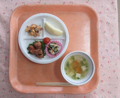 - ※献立表には載せていませんが盛り付け時は、キャベツ・ブロッコリー・トマト・枝豆・とうもろこし等を添え野菜として使用しています。