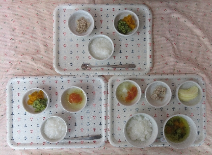 お子さまの発達状態(咀嚼状態)に応じて、適切な内容や形状および量を準備しています。 本日の離乳食は3種類です。